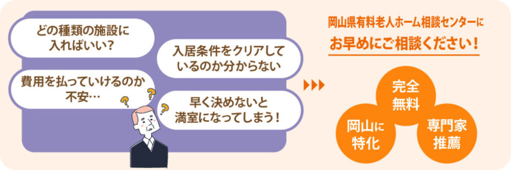 また、私たち【岡山県有料老人ホーム相談センター】では、様々なご希望やご予算をお申し付けいただくと、無料で介護施設をご提案させていただきます。