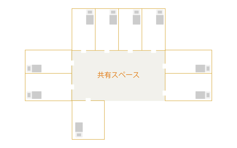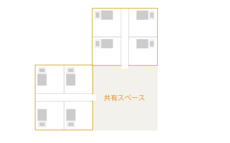 基本的に、ひとつの共有スペースに9つ程度の個室が繋がっており、これを1ユニットとします。