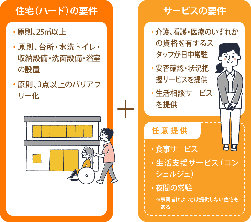 サービス付き高齢者向け住宅とは、高齢者を対象とした、安全安心な生活を送るためのサービスを提供する、独立したバリアフリー居住住宅のことです。