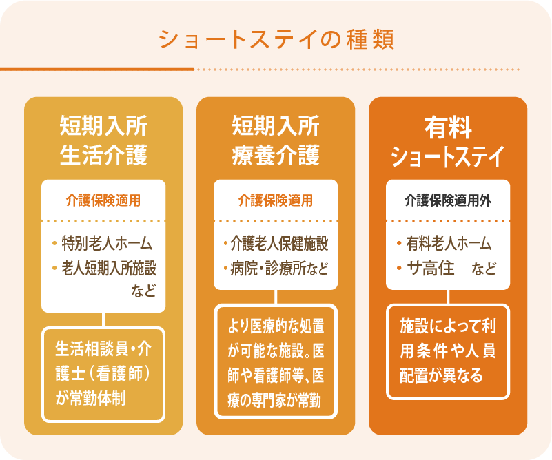 短期入所生活介護、短期入所療養介護は介護保険が適用されますが、その他の有料老人ホームやサービス付き高齢者向け住宅が提供しているショートステイサービス(有料ショートステイ)は、基本的に介護保険適用外です。